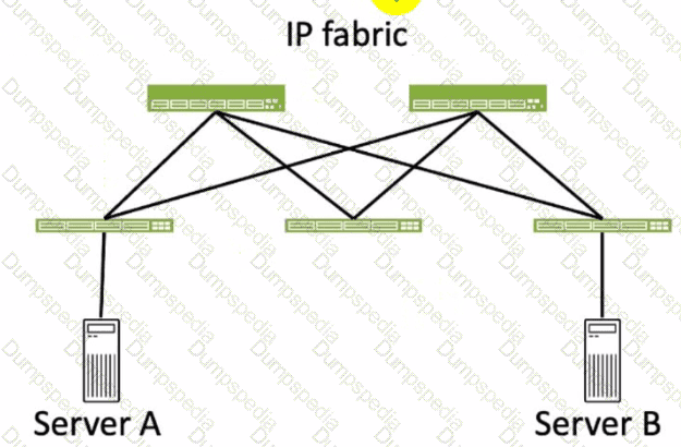 Referring to the exhibit, how many broadcast domains will an Ethernet frame pass through when traversing the IP fabric from Server A to Server B?
