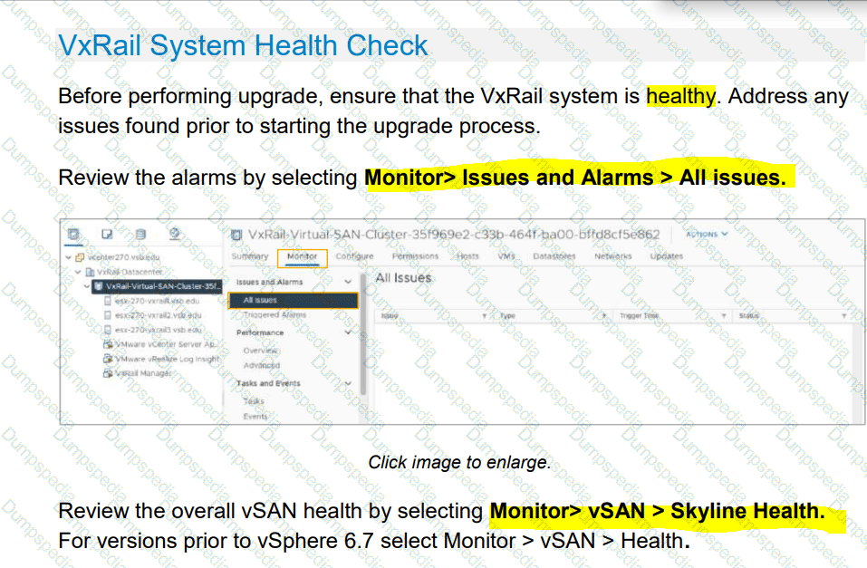A systems engineer needs to ensure that the VxRail system is healthy and any issues found are addressed prior to starting an upgrade process. Where in the vSphere Client can they review alarms and overall vSAN health?