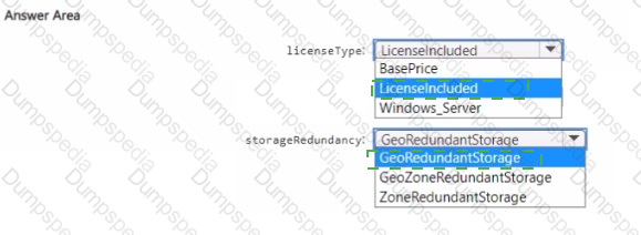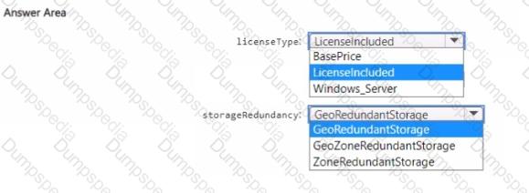 You need to specify the licenseType and storagenedundancy parameters. The deployment must meet the availability requirements and the business requirements for DB1 and DB2.