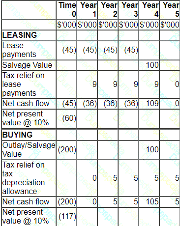 The trainee management accountant has begun evaluating the lease versus buy decision and has produced the following data. He is not confident that all this information is relevant to this decision.