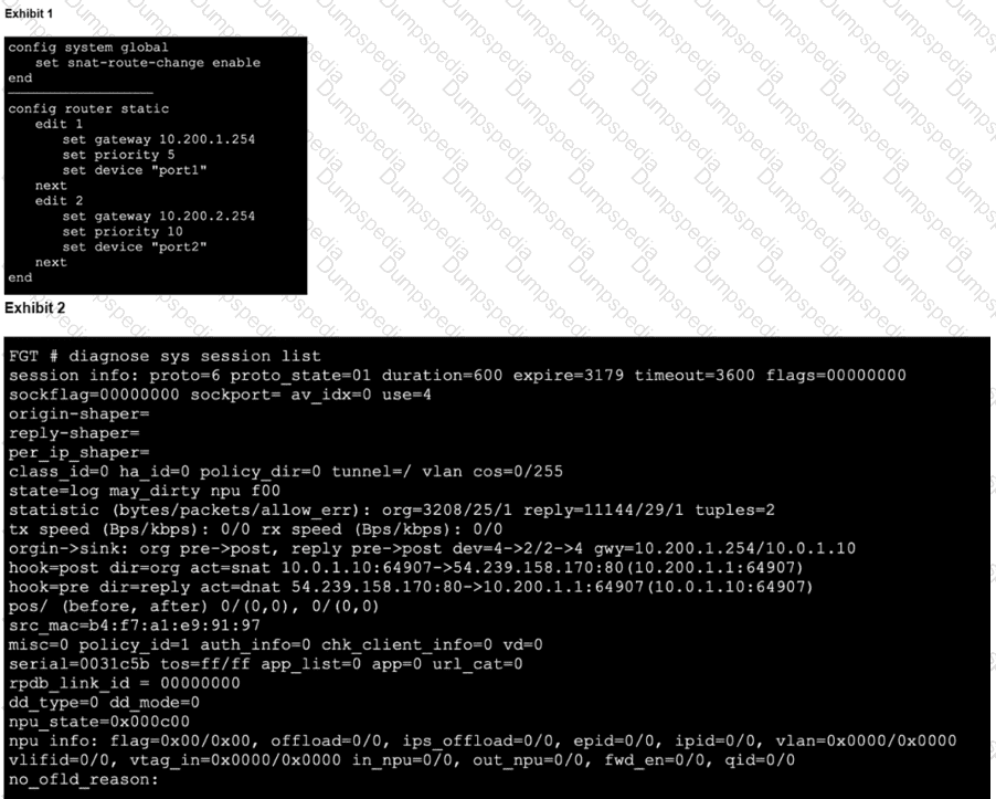 which show the configuration on FortiGate and partial session information for internet traffic from a user on the internal network. If the priority on route ID 2 were changed from 10 to 0, what would happen to traffic matching that user session? (Choose one answer)