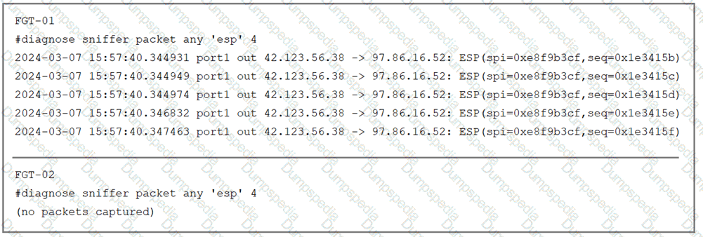 The sniffer log on two FortiGate devices are shown. Based on the information in the log, which two factors explain the output on FortiGate FGT-02? (Choose two answers)
