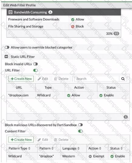 Which action does FortiGate lake if a user attempts to access www. dropbox. com, which is categorized as File Sharing and Storage?