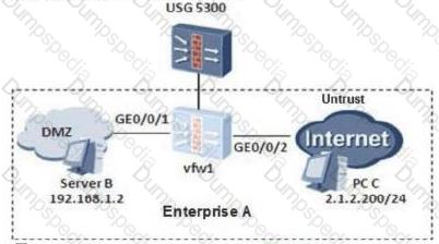 On the following virtual firewall network, the USG unified security gateway provides leased services to the enterprise. The VPN instance vfw1 is leased to enterprise A. The networking diagram is as follows. The PC C of the enterprise A external network user needs to access the intranet DMZ area server B through NAT. To achieve this requirement, what are the following key configurations?