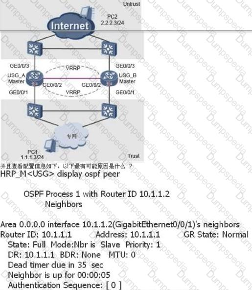 The dual-system hot standby networking environment is as shown in the following figure: VRRP group 1 and 2 are added to the VGMP management group, USG_A is the master device, and USG_B is the standby device. When the USG_A has a fault Status, such as power failure, the USG_B status is switched from Slave to Master. After the USG_A is faulty, its status is switched back to Master and the USG_B status is still Master. What is the reason for this now?