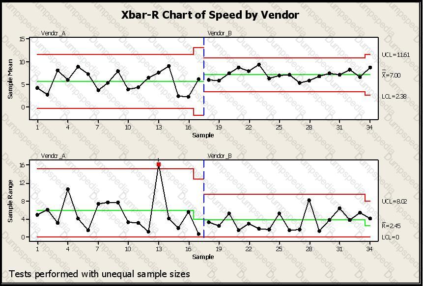 SPC Charts are used extensively in different business and decision-making environments. In this example a vendor is being selected based on speed of delivery. Which of the conclusions would help you pick a vendor for your needs regarding lead-time of delivery from your vendors? (Note: There are 4 correct answers).