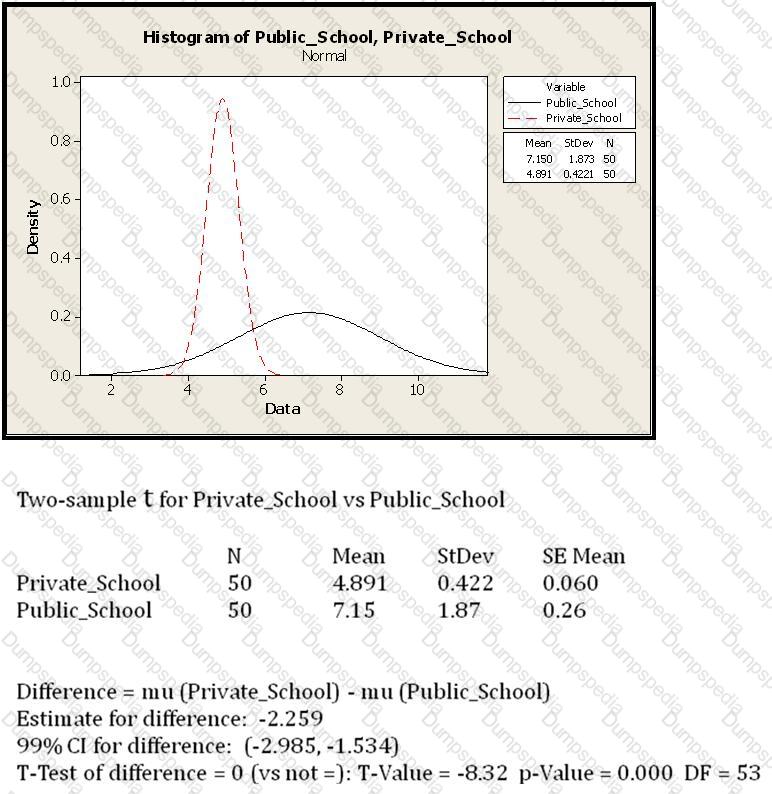 The class score distribution of schools in a metropolitan area is shown here along with an analysis output. Comment on the statistical significance between the Means of the two distributions. Select the most appropriate statement.