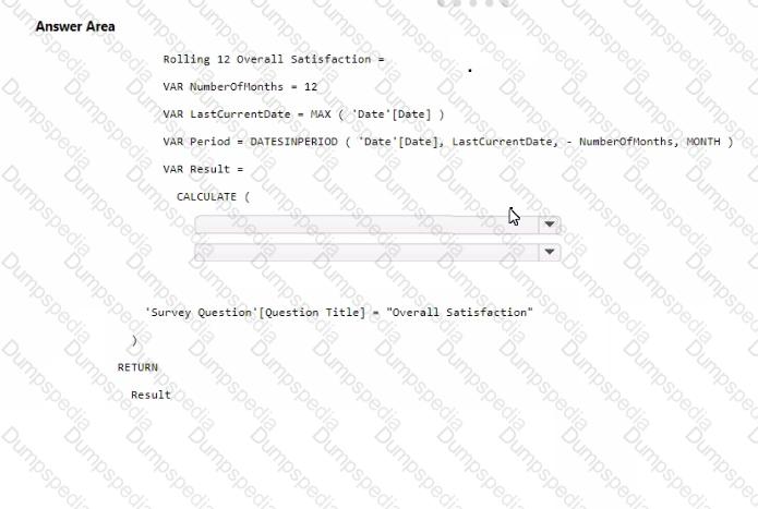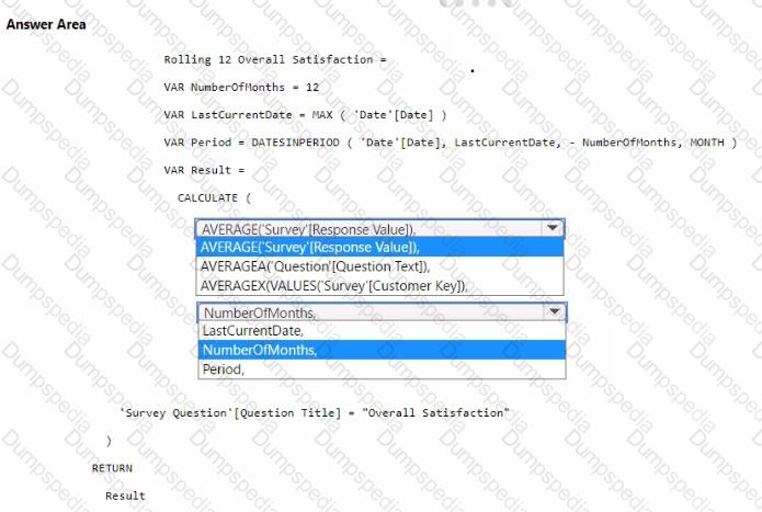 How should you complete the DAX expression? To answer, select the appropriate options in the answer area. NOTE: Each correct selection is worth one point.