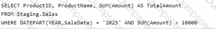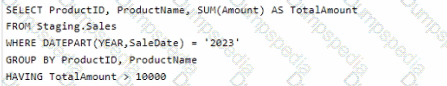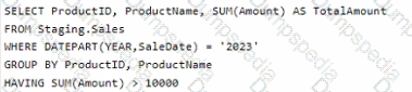You need to write a T-SQL query that will return data for the year 2023 that displays ProductID and ProductName arxl has a summarized Amount that is higher than 10,000. Which query should you use?