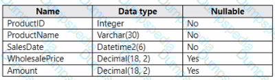 You have a Fabric warehouse that contains a table named Staging.Sales. Staging.Sales contains the following columns.