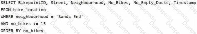 You need to apply transformation and filter logic to prepare the data for consumption. The solution must return data for a neighbourhood named Sands End when No_Bikes is at least 15. The results must be ordered by No_Bikes in ascending order.