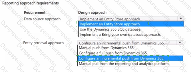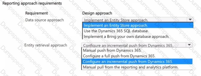 Which design approach should you use for each requirement? To answer, select the appropriate options in the answer area.