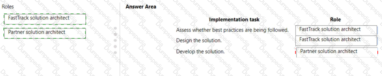 Which role is responsible for each implementation task? To answer, drag the appropriate roles to the correct implementation tasks. Each role may be used once, more than once, or not at all. You may need to drag the split bar between panes or scroll to view content.