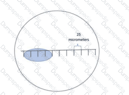 If each division in the ocular micrometer below equals 25 micrometers, what is the length of the oval?
