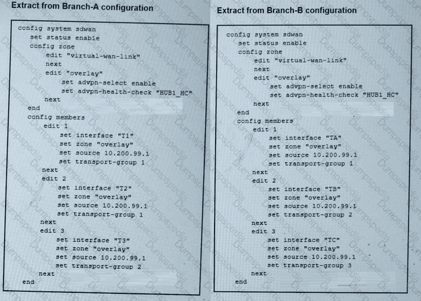 The SD-WAN zones and members configuration of two branch devices are shown. The two branch devices are part of the same hub-and-spoke topology and connect to the same hub. The devices are configured to allow Auto-Discovery VPN (ADVPN). The configuration on the hub allows the initial communication between the two spokes.