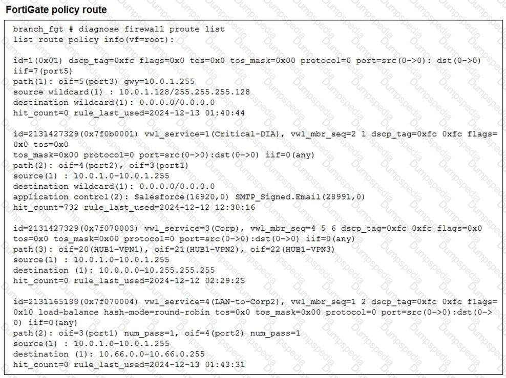 (Refer to the exhibits. You collected the output shown in the exhibits and want to know which interface TCP traffic will flow through from the user device 10.0.1.101 to the corporate file server 10.0.0.125. All SD-WAN links are stable.
