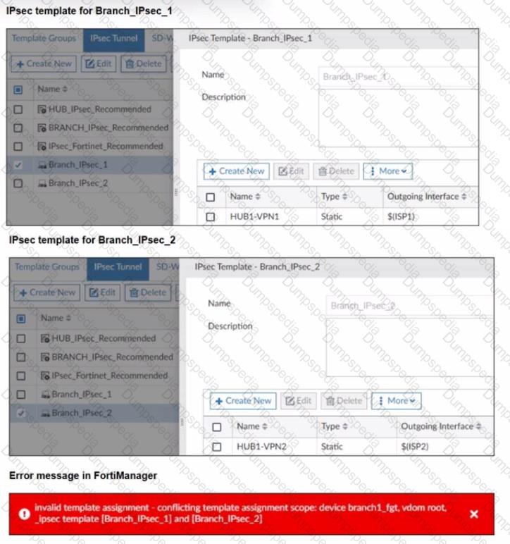 The exhibits show two IPsec templates to define Branch IPsec 1 and Branch_IPsec_2. Each template defines a VPN tunnel. The error message that FortiManager displayed when the administrator tried to assign the second template to the FortiGate device is also shown.