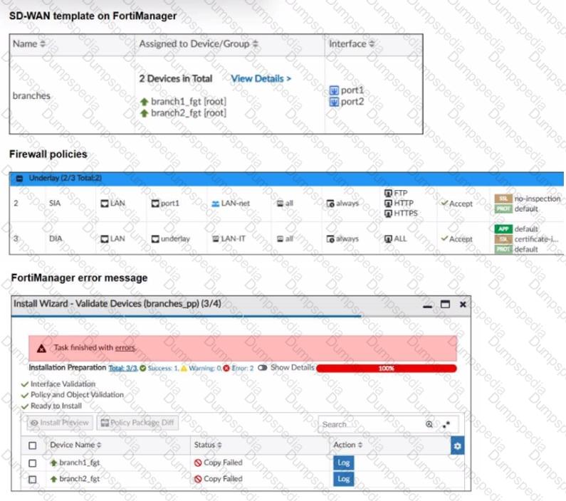 Then, when you use the install wizard to install the configuration and the policy package on the branch devices, FortiManager reports an error as shown in the third exhibit.