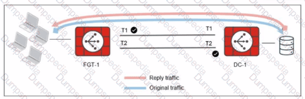 When the LAN clients located behind FGT1 establish a session to a server behind DC-1, the administrator observes that, on DC-1, the reply traffic is routed overT2. even though T1 is the preferred member in