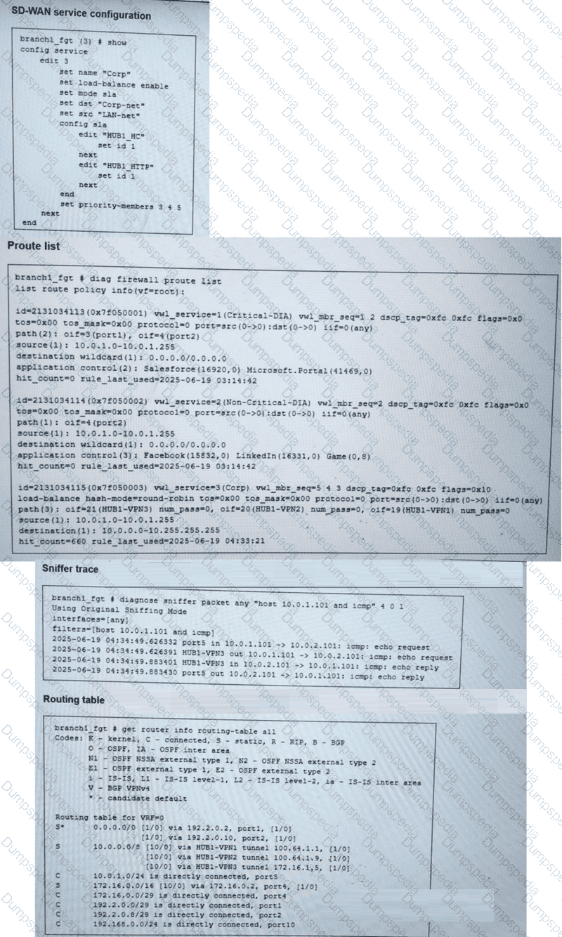 (Refer to the exhibits. You collected the output shown in the exhibits and want to know which interface TCP traffic will flow through from the user device 10.0.1.101 to the corporate file server 10.0.0.125 . All SD-WAN links are stable.