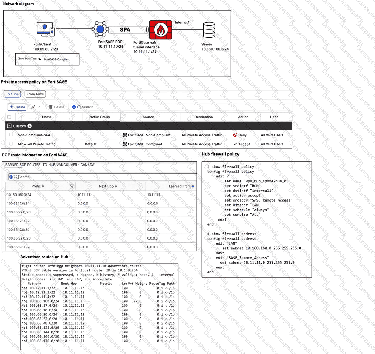 A FortiSASE administrator has configured FortiSASE as a spoke to a FortiGate hub. The tunnel is up to the FortiGate hub. However, the remote FortiClient is not able to access the web server hosted behind the FortiGate hub. What is the reason for the access failure? (Choose one answer)
