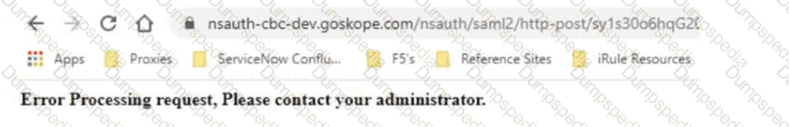 Netskope has been deployed using Cloud Explicit Proxy and PAC files. Authentication using Active Directory Federation Services (ADFS) has been configured for SAML Forward Proxy auth. When the users open their browser and try to go to a site, they receive the error shown in the exhibit.