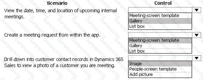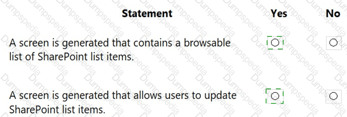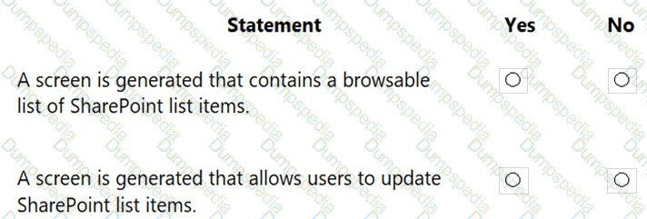 You create a canvas app by using the option labeled Start from data. You connect a spreadsheet that contains customer records. The customer records are displayed in a list on a screen labeled Browse.