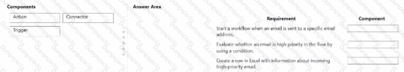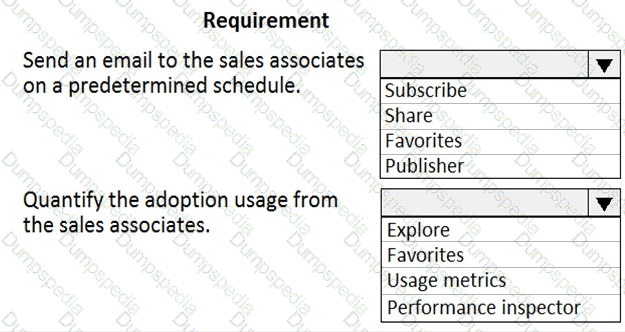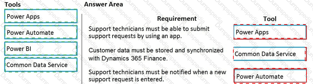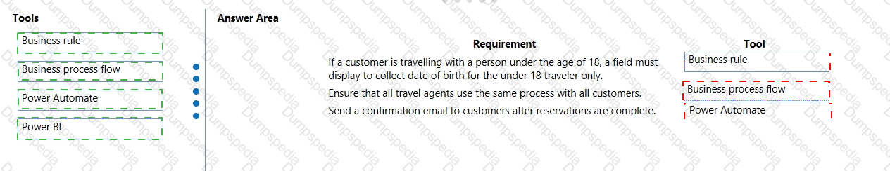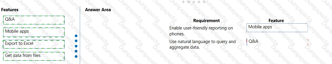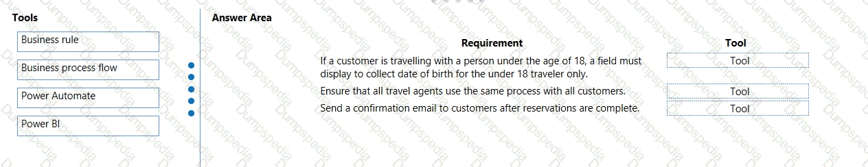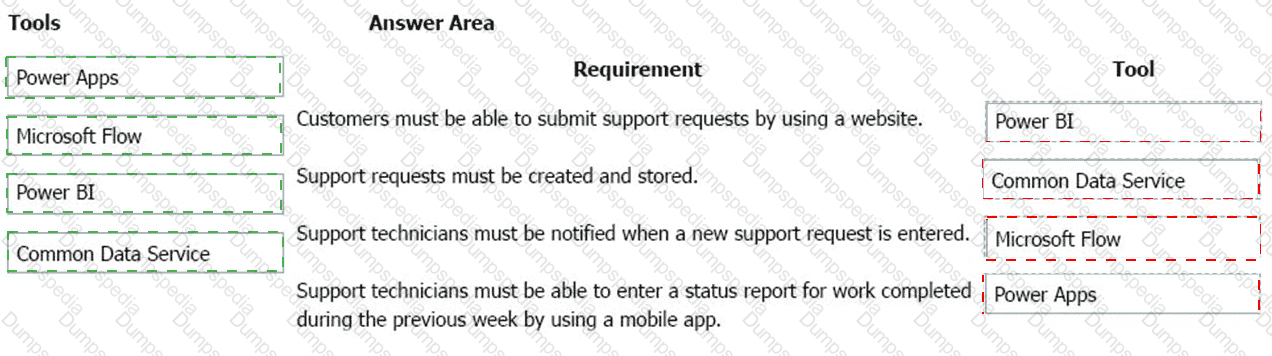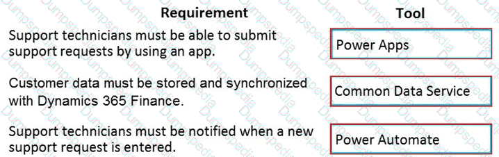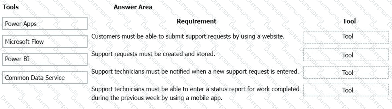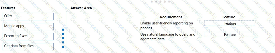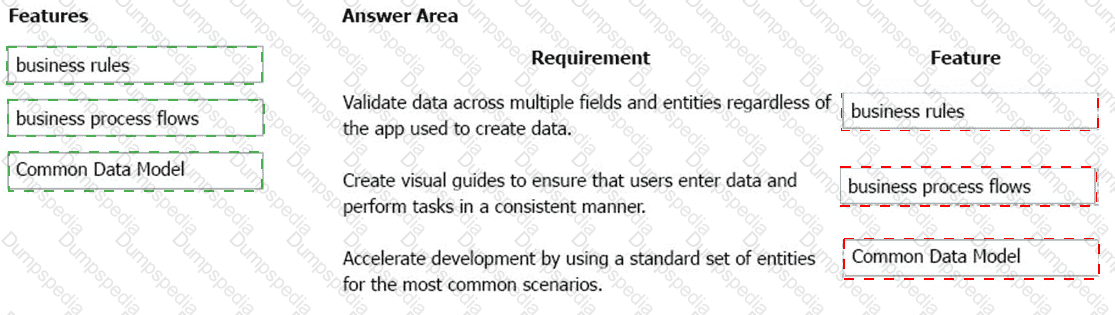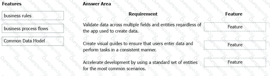 Which Power Platform features should you recommend? To answer, drag the appropriate features to the correct requirements. Each feature may be used once, more than once, or not at all. You may need to drag the split bar between panes or scroll to view content.