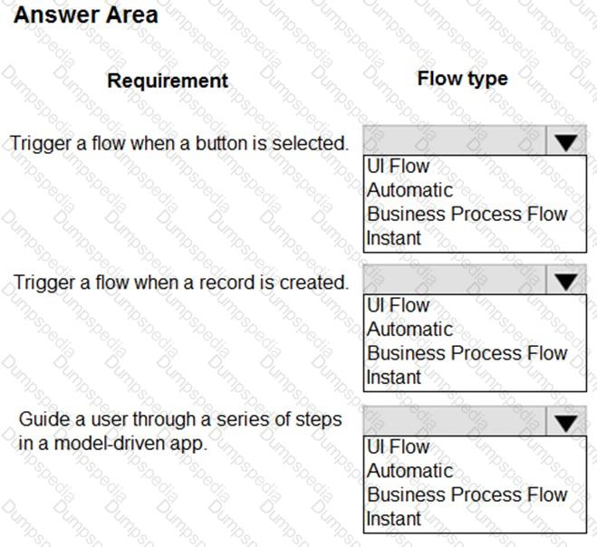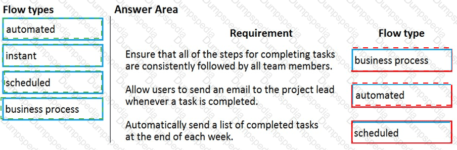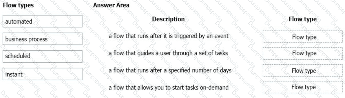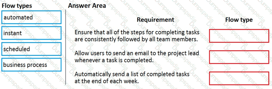 Which types of flows should you use? To answer, drag the appropriate flow types to the correct requirement. Each flow type may be used once, more than once, or not at all. You may need to drag the split bar between panes or scroll to view content.