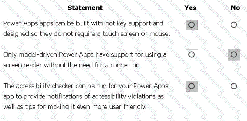 You are creating a model-driven Power Apps app. You want to ensure that the app can be used by individuals who have vision impairments.