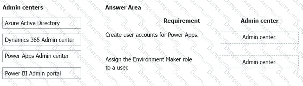 Which admin centers should you use? To answer, drag the appropriate admin centers to the correct requirements. Each admin center may be used once, more than once, or not at all. You may need to drag the split bar between panes or scroll to view content.