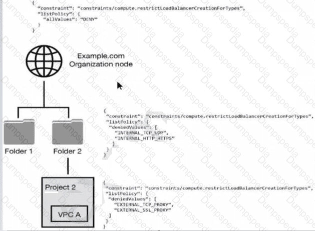 You have the following resource hierarchy. There is an organization policy at each node in the hierarchy as shown. Which load balancer types are denied in VPC A?