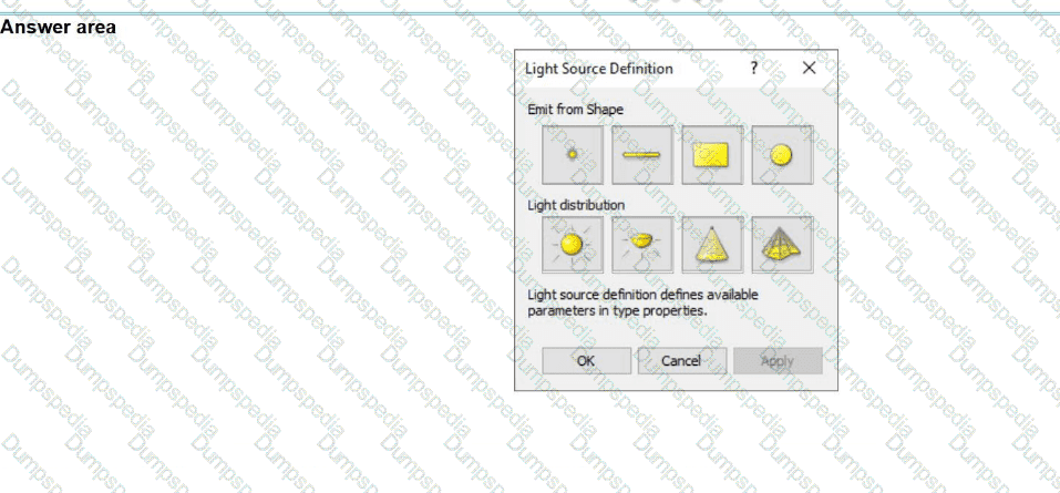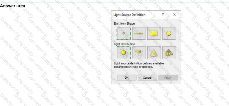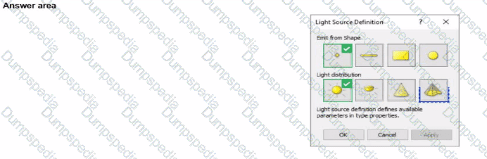 Define the light source's Emit Shape and Light Distribution for use with the photometric web (IES) file. (Select two in the answer area.)